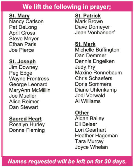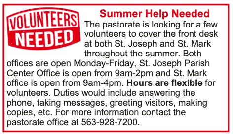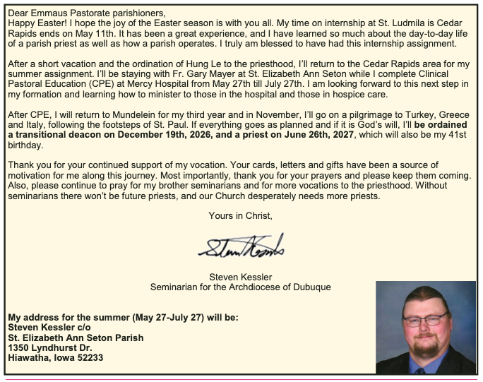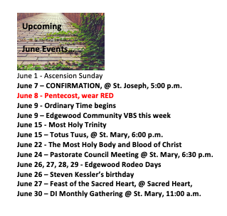Please join us for the Confirmation Mass at St. Joseph's in Elkader on June 7 at 5:00 p.m., and continue to pray for our Emmaus Pastorate Confirmation students and their teachers, Jane Christiansen and Diane Meyer, as they continue on their faith journey as they receive the Sacrament of Confirmation.